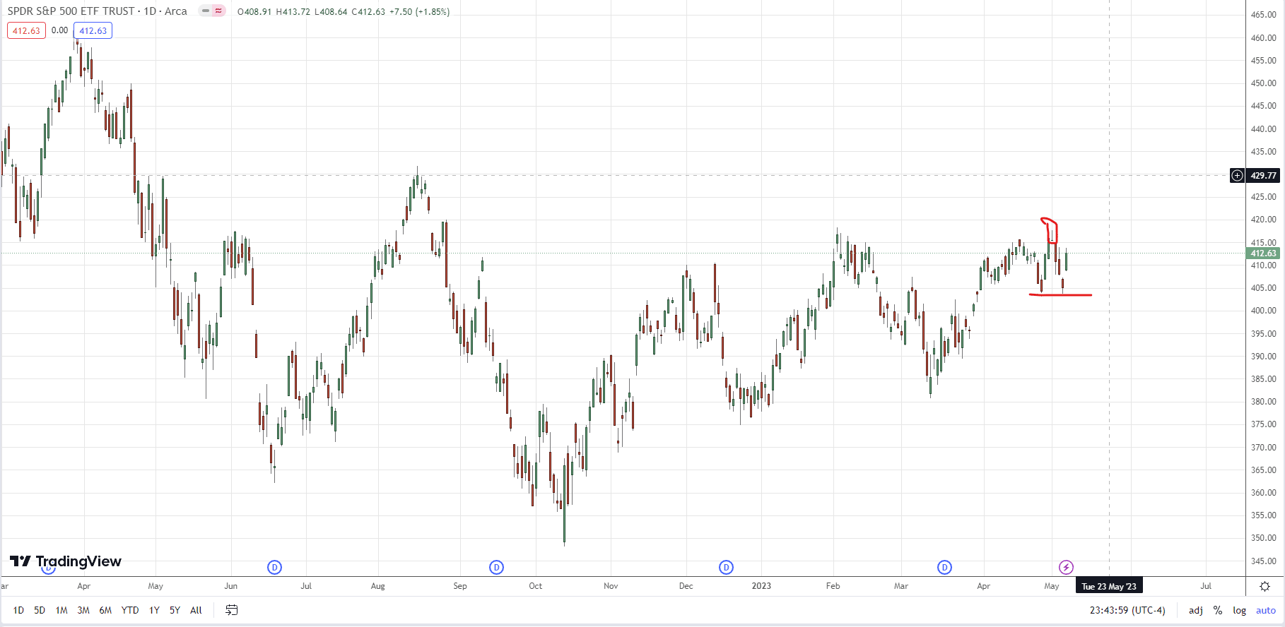 我不會預期星期三出利率決議,星期一低成交量就可以做突破。隨後回調連續4天,剛剛好去到405,之前的Higher low 由於暫時沒有跌破上一個Higher low, 因此我也不會過份看淡。